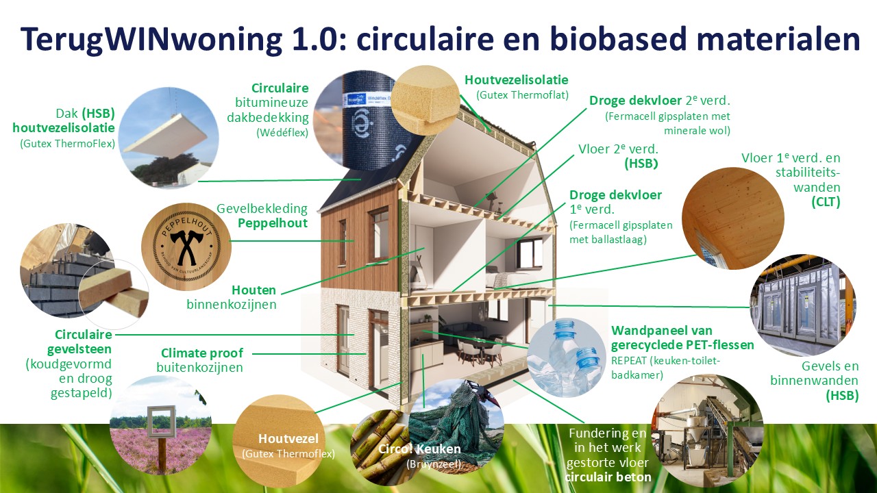 De drie typen demonstratiewoningen, wij noemen ze 'TerugWINwoningen', laten zien wat de potentie is van circulair en biobased bouwen, met als resultaat een significante CO2-reductie.