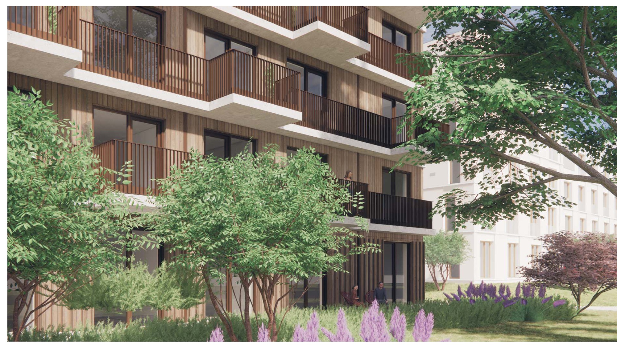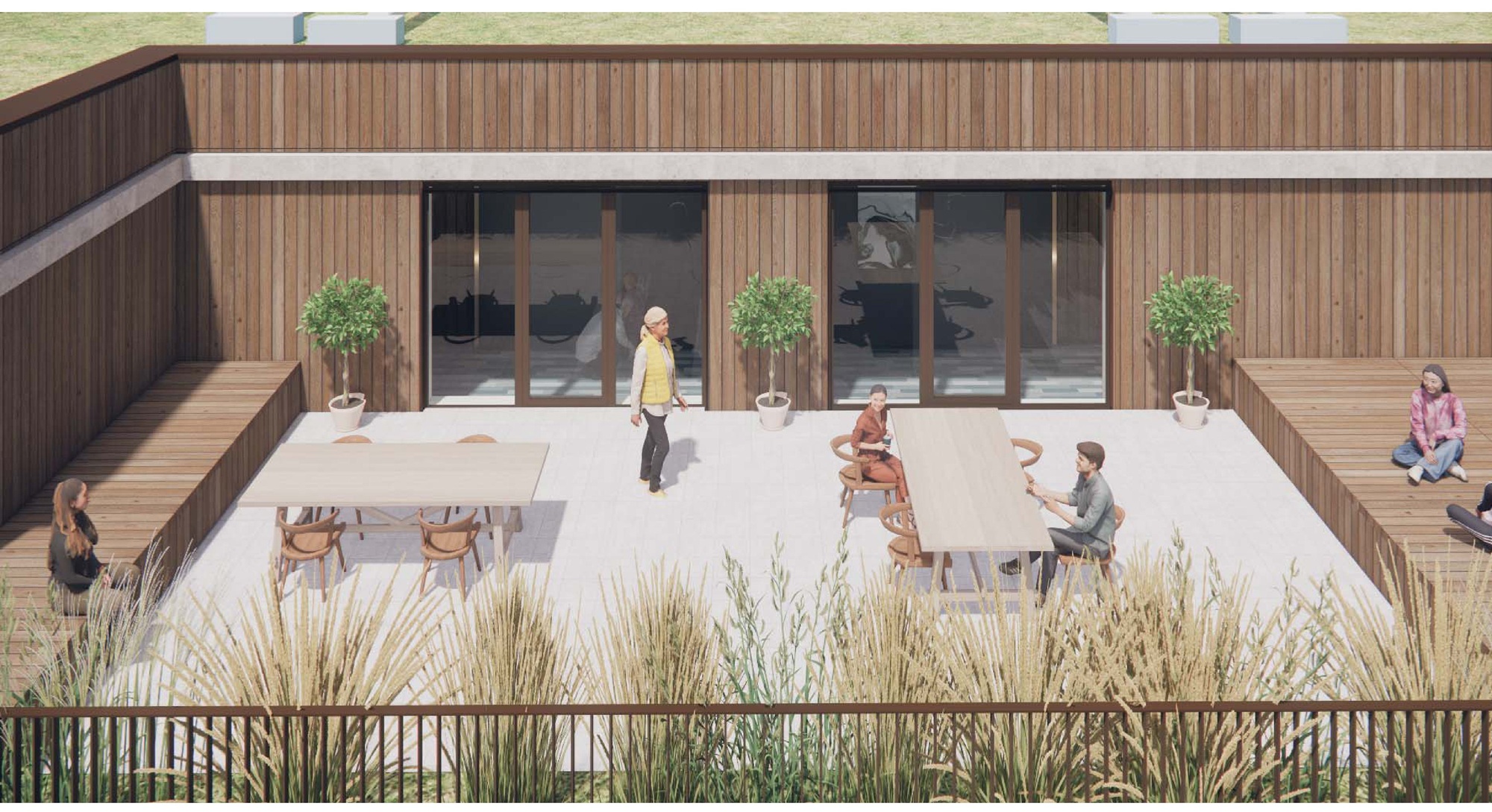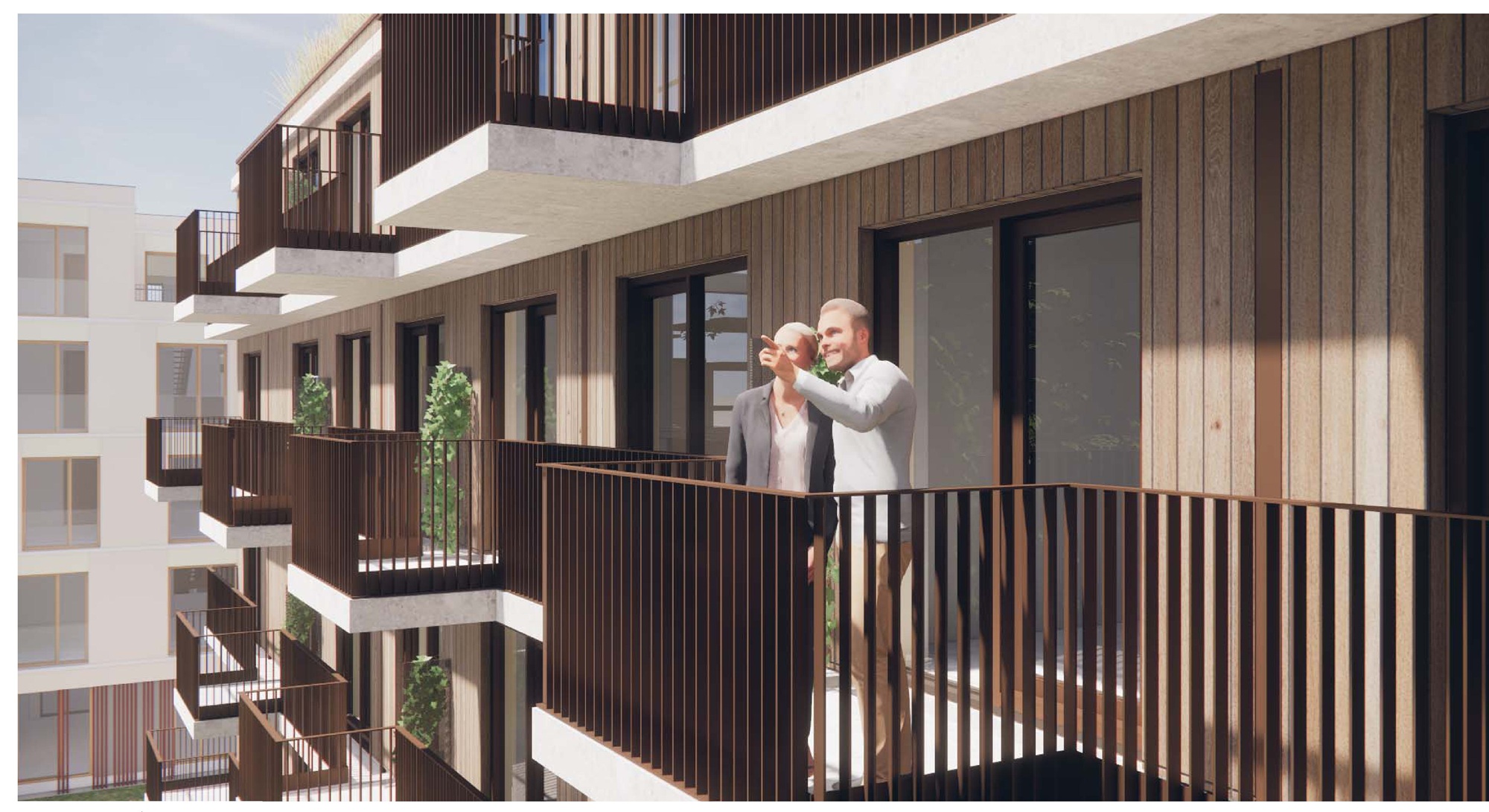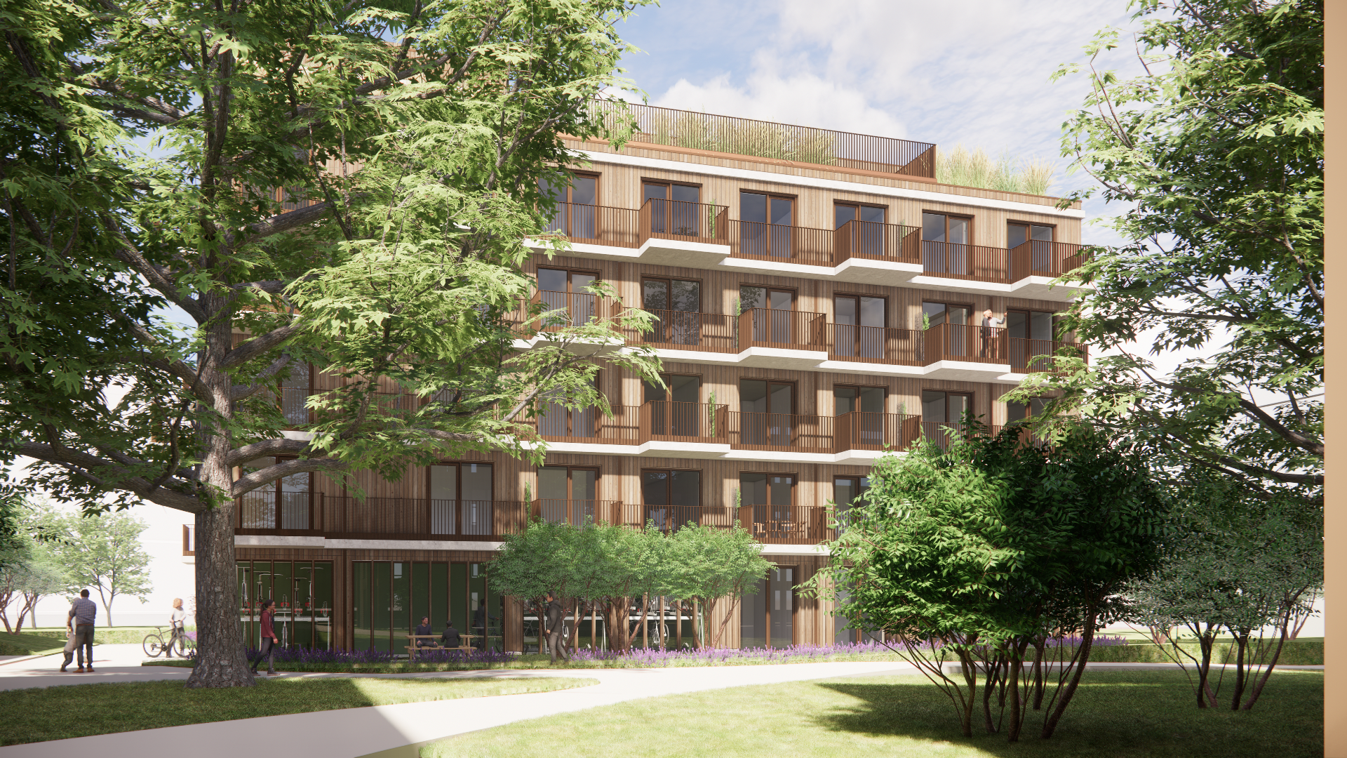 Op de vijfde verdieping komt een gedeeld dakterras met een natuurinclusieve daktuin en geïntegreerde nestkasten. Deze plek is voor bewoners én insecten een waardevolle groene ruimte. De gevel wordt uitgevoerd met luxe bamboe bekleding, waarmee het gebouw een toekomstbestendige, warme en natuurlijke uitstraling krijgt.