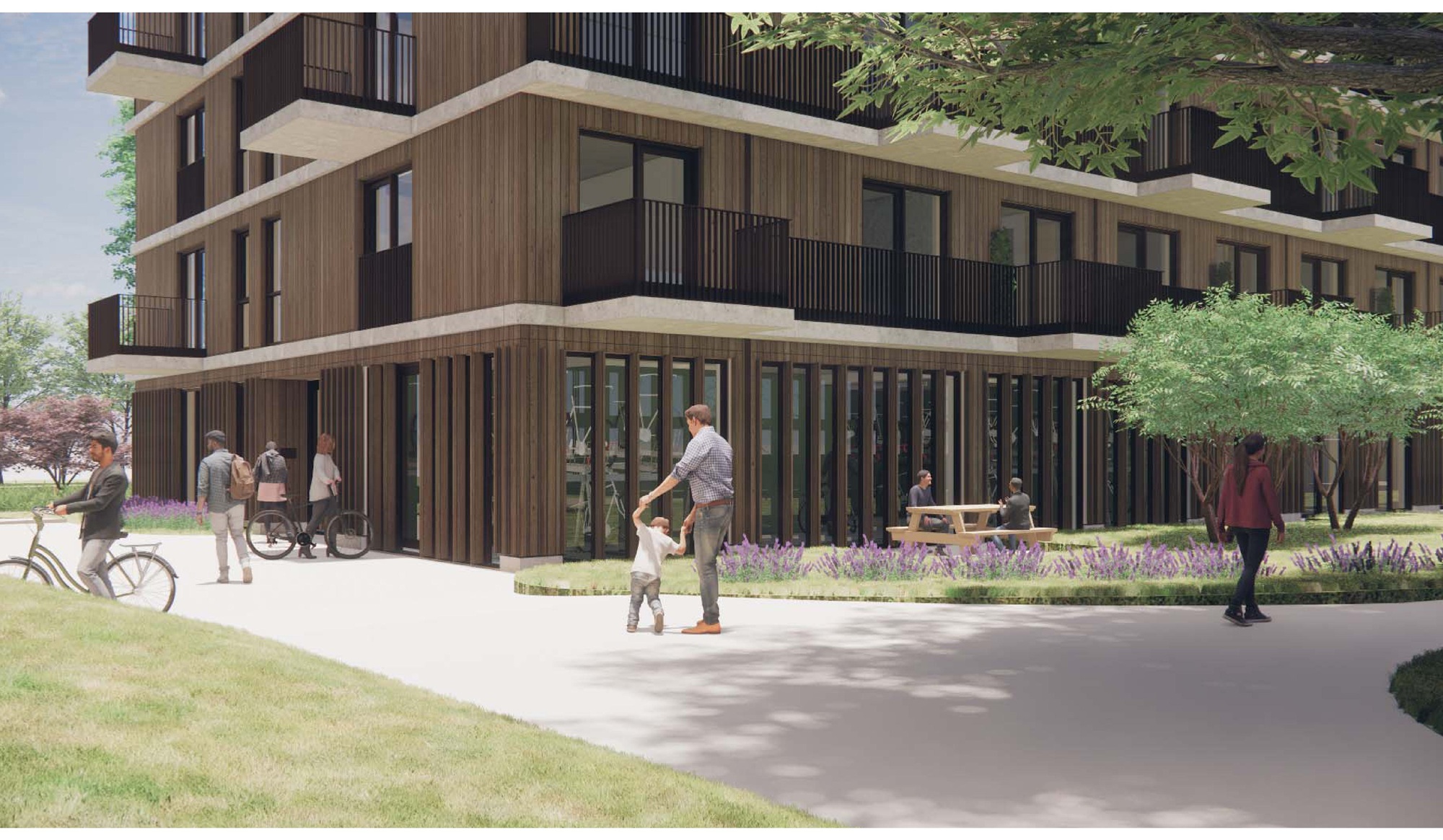 Daarnaast zorgen de inpandige fietsenstalling en afvalruimte ervoor dat de buitenruimte opgeruimd en prettig groen blijft. Het gebouw sluit zo aan op het toekomstige park dat de gemeente rondom het project aanlegt.